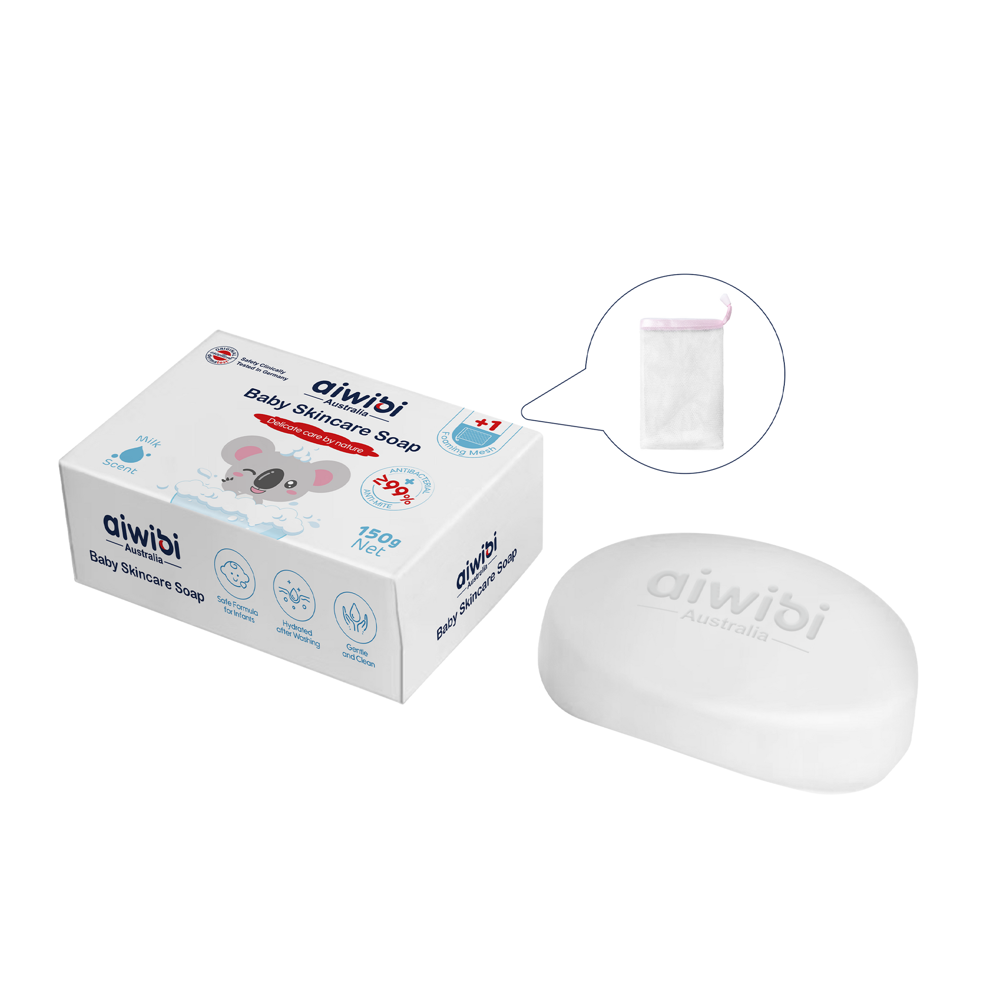Aiwibi Bath Soap delivers powerful yet gentle cleaning, boasting over 99% antibacterial and antifungal properties to protect baby's delicate skin. Formulated without irritating chemicals, brighteners, or bleaches, it ensures a pure wash. For added convenience, each boxed soap comes with its own foaming net.