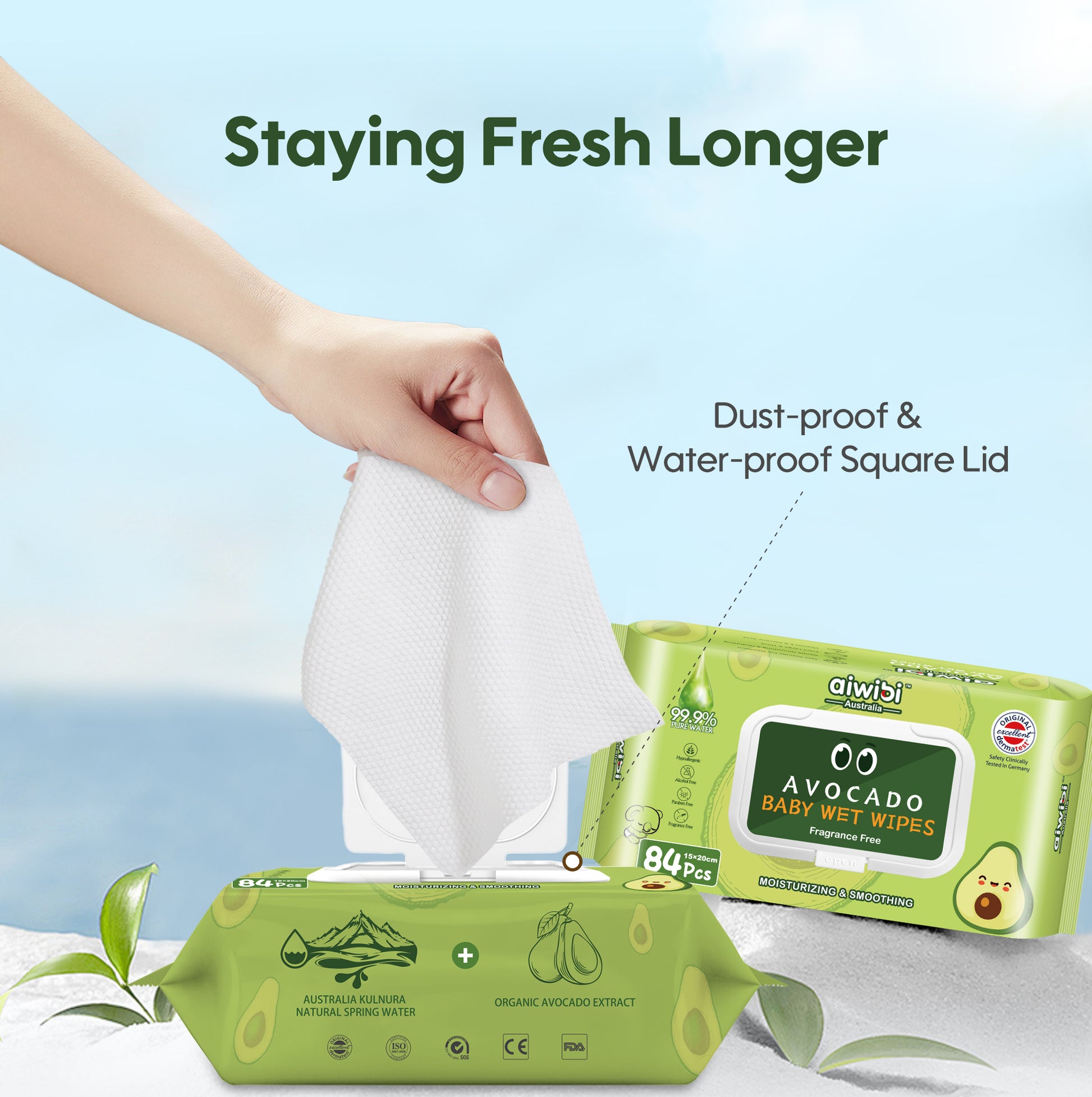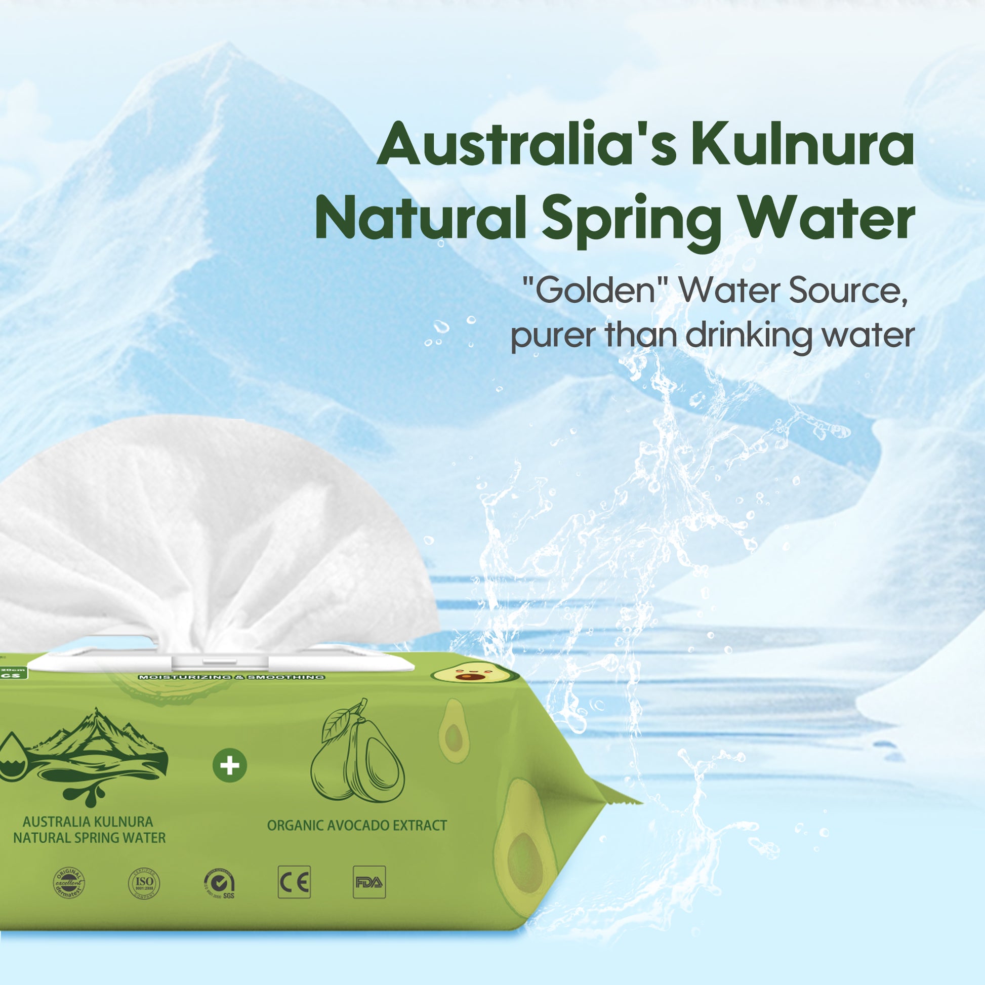 Where clean meets refreshing! Infused with natural Australian Kulnura spring water, these wipes offer a gentle touch, perfect for your baby's delicate skin. With 99.9% EDI pure water, they ensure a soft and effective clean. The wipes are larger, thicker, and ultra-soft, providing a luxurious feel while the organic extracts of avocado deliver nourishing hydration.