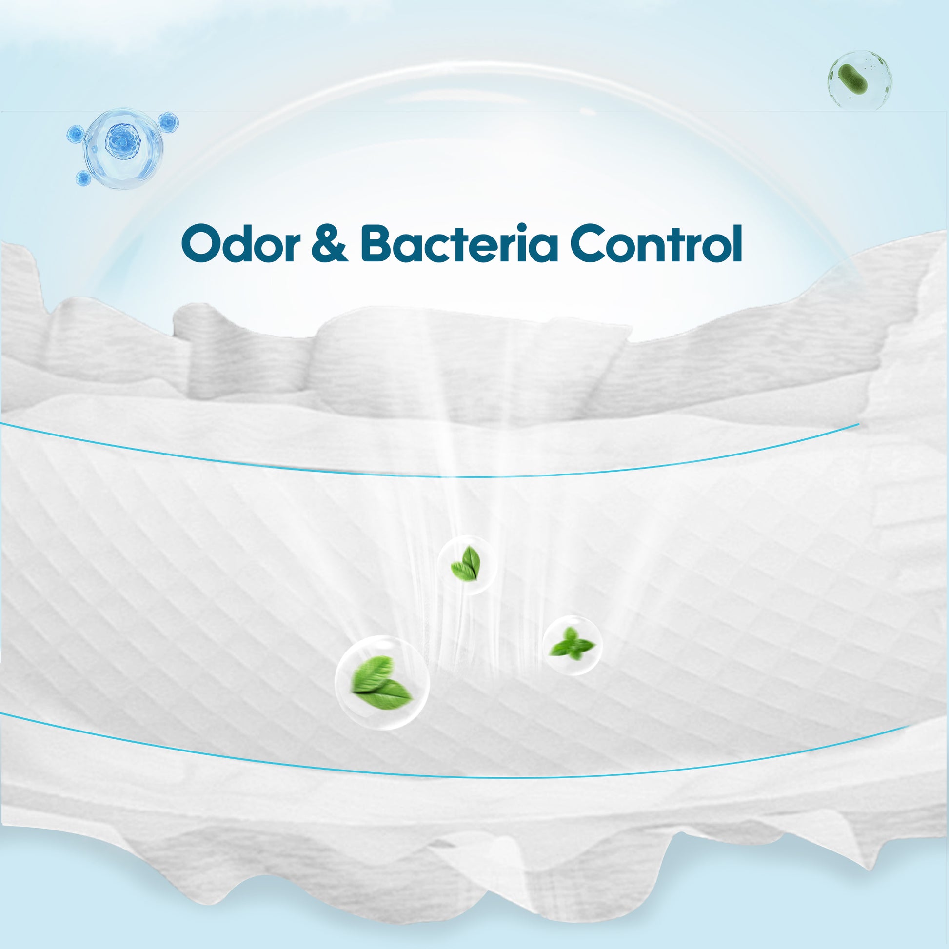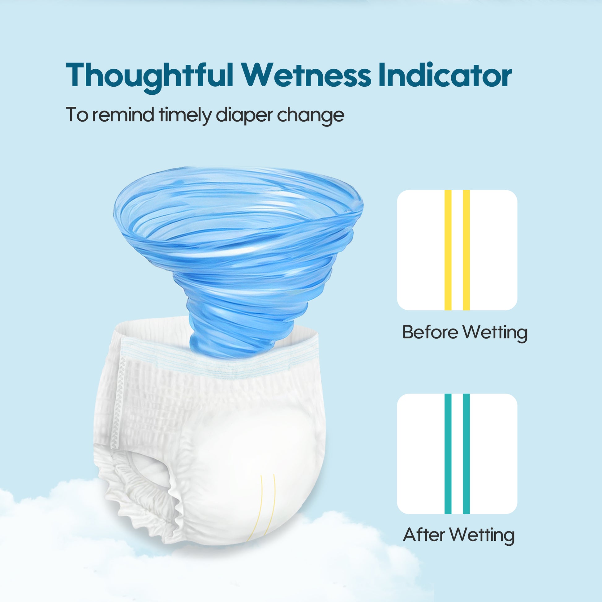 To prevent any leakage, we've incorporated leg cuffs, giving you the confidence to go about your day without worry. The ADL layer helps the urine diffuse quickly, enhancing the absorption efficiency and keeping you dry and fresh. A wetness indicator is also included, which will remind you to change the diaper in a timely manner, ensuring hygiene and convenience.