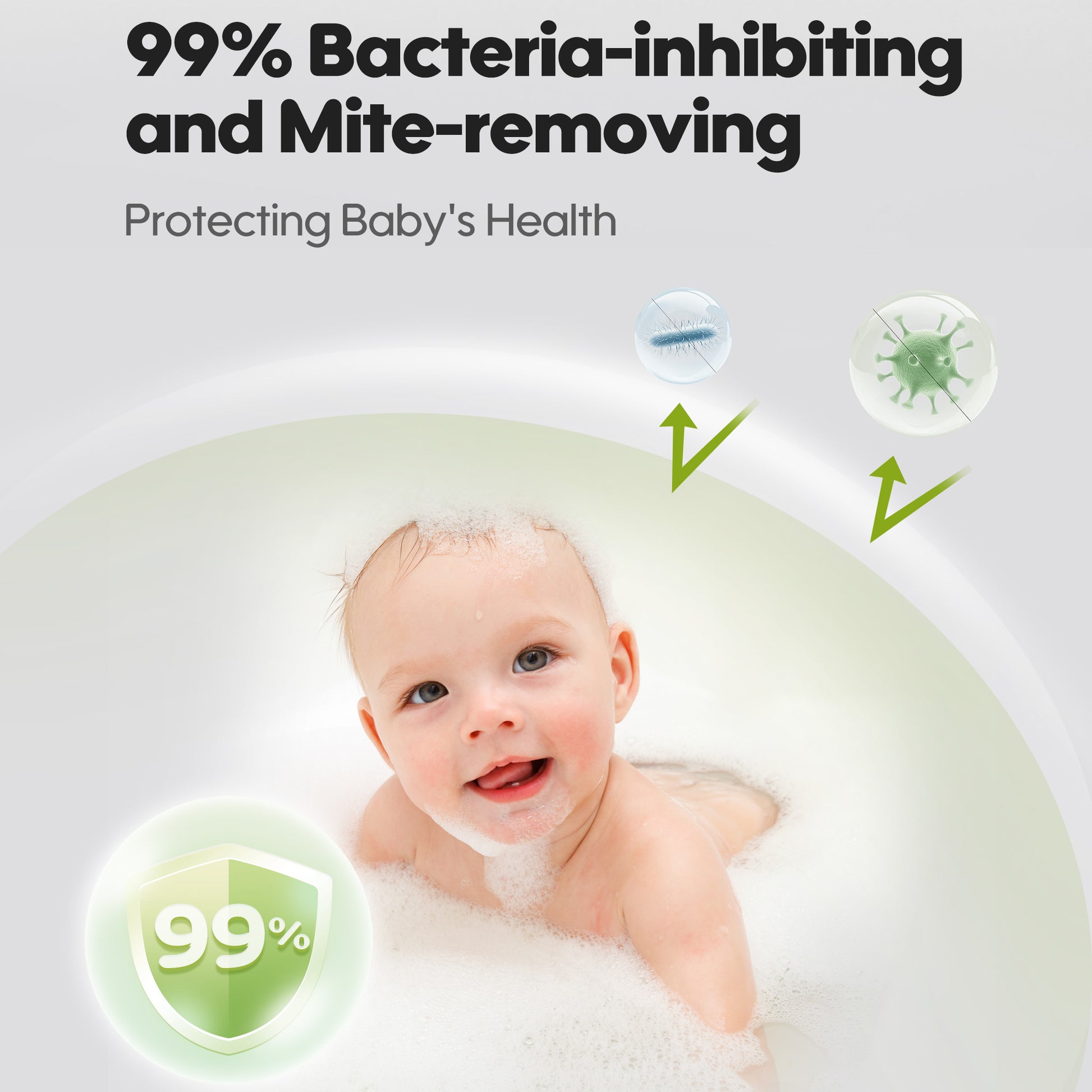 99% bacteria-inhibiting and mite-removing prevents bacteria and mite buildup, safeguarding delicate baby skin.
