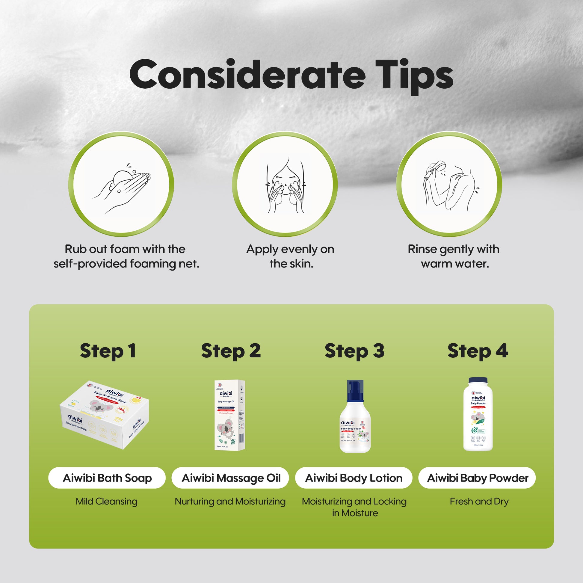 Aiwibi Skincare Soap removes dirt, bacteria, and excess oil while offering ≥99% anti-bacterial and anti-mite protection. Its dense and thick foam deeply cleanses without stripping natural moisture, suitable for baby’s delicate skin.