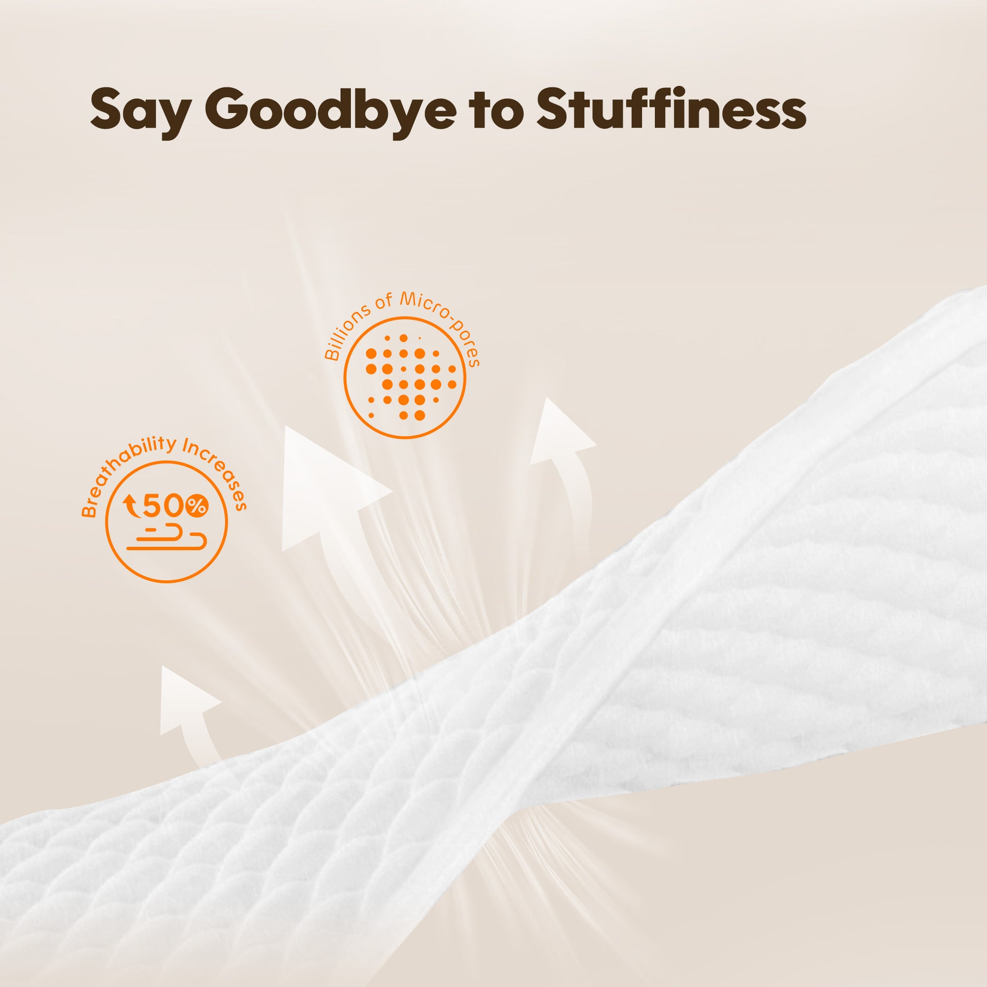 Exclusive MicroAiry Film™, designed with billions of ultra-fine micro-pores. This breathable PE film allows air to flow freely while preventing water from passing through, increasing breathability by 50%.